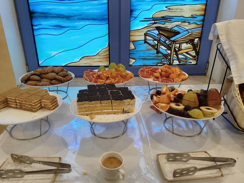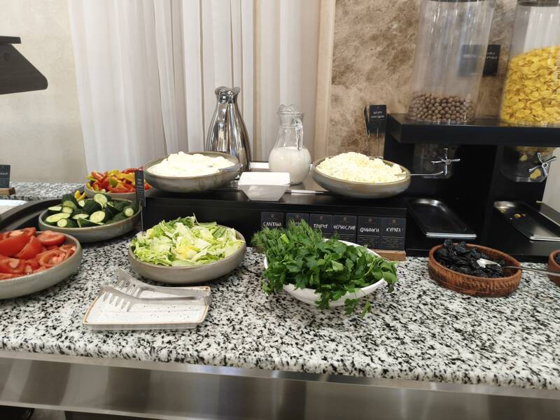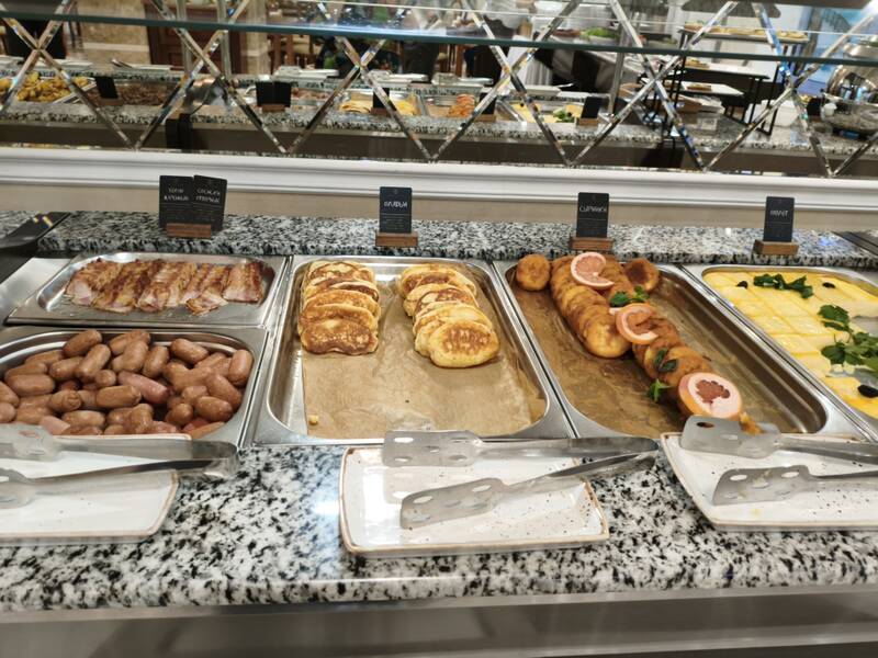 Покажу завтрак в отеле. Сразу скажу, что в Магнолии было лучше. У меня хоть и жёсткая диета, ноя всё равно отметила, что в Магнолии больше выпечки - пирожки разные, слойки, сдоба, а здесь только бисквиты. Блинов как в Магнолии нет совсем, что очень странно, обычное блюдо на завтрак в любом отеле. В Магнолии были сыры разные, колбасная нарезка в широком ассортименте, здесь гораздо меньше выбор. Но здесь разнообразие соков предлагают, много рыбы.